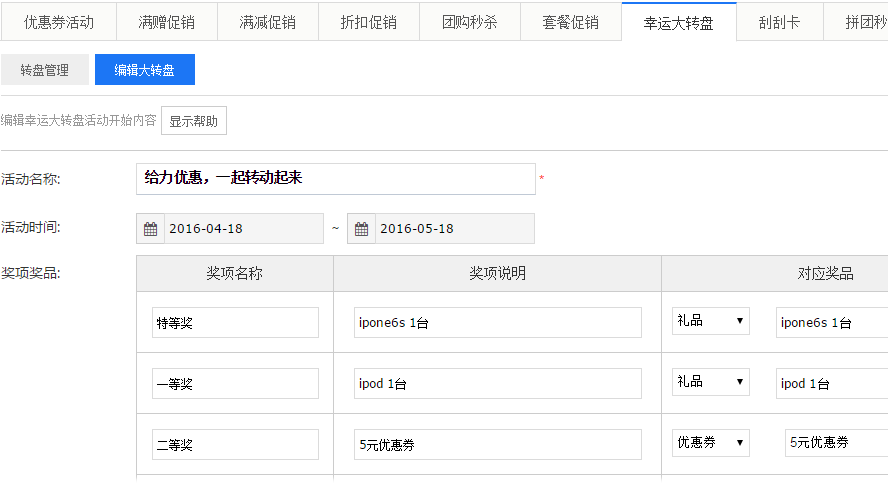 大转盘为商家提供转盘抽奖服务,商家只需设置活动时间、活动规则、活动奖品等信息就能发起活动,粉丝进入活动界面,点击开始抽奖,即有几率获得不同类型的奖品。